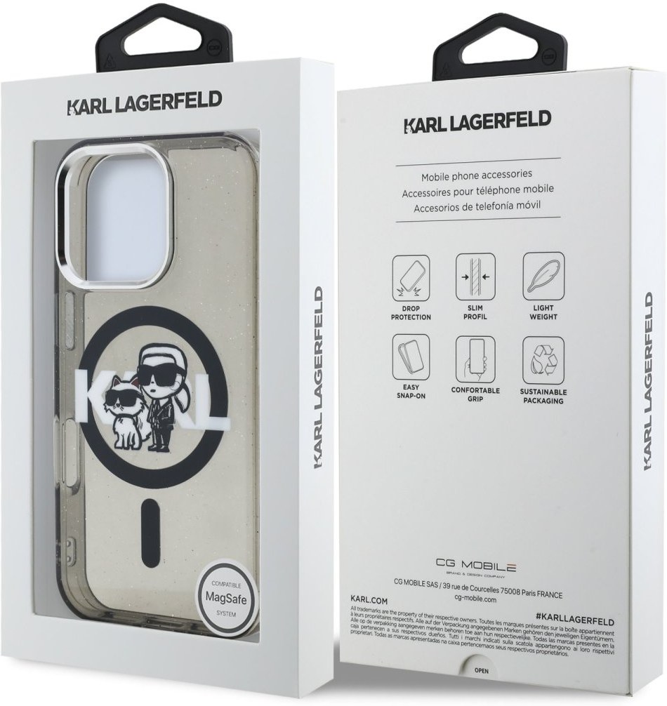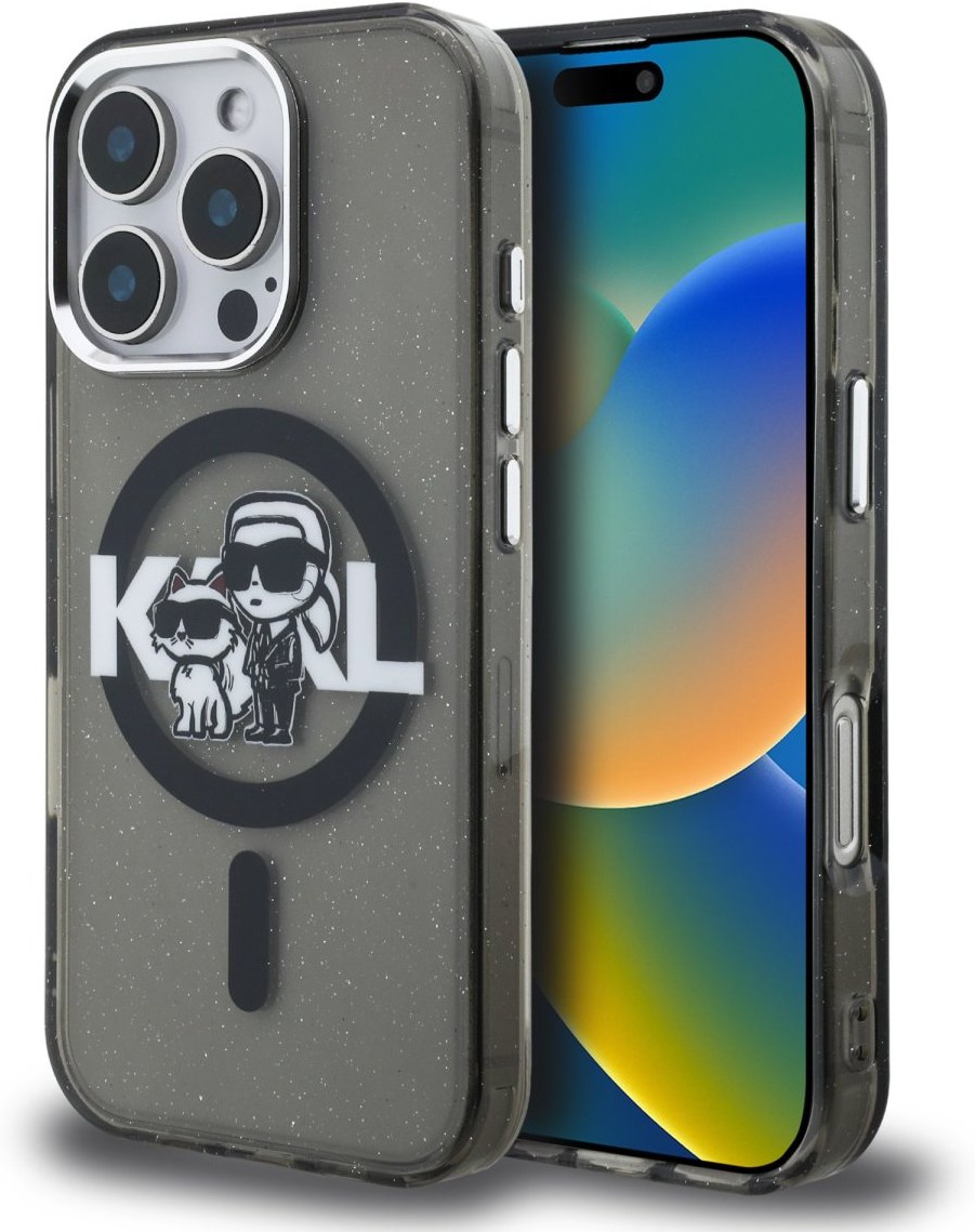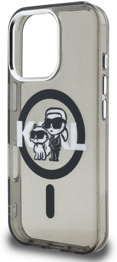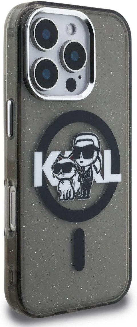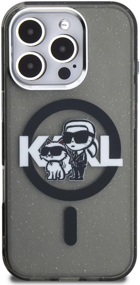 Karl Lagerfeld IML Glitter Karl and Choupette Sketch MagSafe kryt pre iPhone 16 Pro Max, čierny