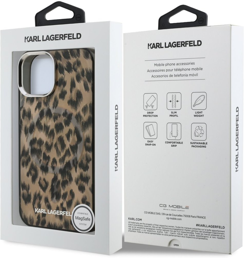 Karl Lagerfeld IML Leopard MagSafe zadný kryt je dokonalý doplnok pre váš telefón aj outfit, ktorý kombinuje funkčnosť a štýl v jednom. Tento kryt je vyrobený z kombinácie pevného PC plastu na zadnej strane a TPU mäkkého plastu na bokoch, čo vytvára dokonalú symbiózu odolnosti a pohodlia. Jeho pružný a mäkký materiál sa prispôsobí tvaru vášho telefónu a umožňuje ľahký prístup ku všetkým tlačidlám a konektorom, zatiaľ čo textúra krytu zaistí, že sa skvele drží v ruke a nešmýka sa. Tento kryt podporuje technológiu MagSafe, čo znamená, že je kompatibilný s bezdrôtovým nabíjaním a ďalšími MagSafe doplnkami. Zaujmite výrazným a odvážnym leopardím vzorom, ktorý okamžite priťahuje pozornosť. Kombinácia hnedých a čiernych tónov evokuje divoký a moderný štýl. Stavte na kvalitu, originalitu a dokonalú ochranu pre váš telefón s prémiovým krytom Karl Lagerfeld.Kľúčové vlastnosti