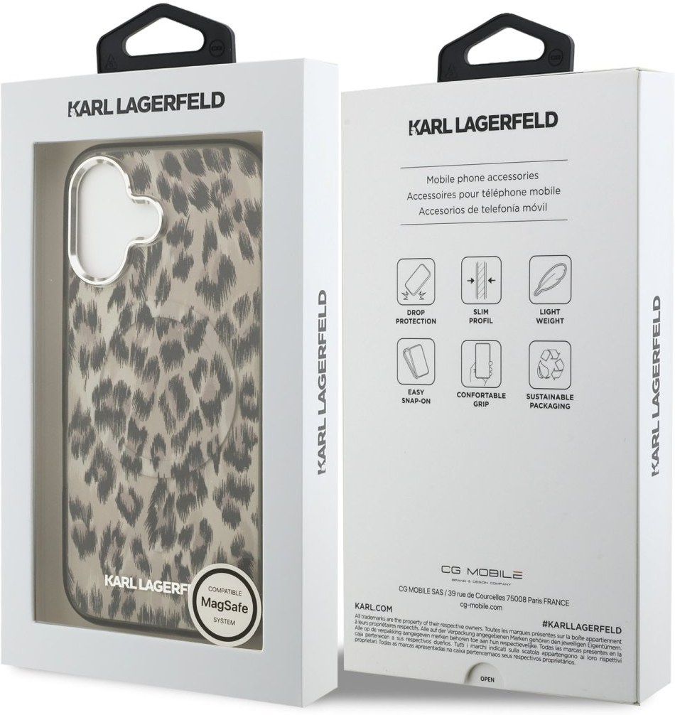 Karl Lagerfeld IML Leopard MagSafe zadný kryt je dokonalý doplnok pre váš telefón aj outfit, ktorý kombinuje funkčnosť a štýl v jednom. Tento kryt je vyrobený z kombinácie pevného PC plastu na zadnej strane a TPU mäkkého plastu na bokoch, čo vytvára dokonalú symbiózu odolnosti a pohodlia. Jeho pružný a mäkký materiál sa prispôsobí tvaru vášho telefónu a umožňuje ľahký prístup ku všetkým tlačidlám a konektorom, zatiaľ čo textúra krytu zaistí, že sa skvele drží v ruke a nešmýka sa. Tento kryt podporuje technológiu MagSafe, čo znamená, že je kompatibilný s bezdrôtovým nabíjaním a ďalšími MagSafe doplnkami. Zaujmite výrazným a odvážnym leopardím vzorom, ktorý okamžite priťahuje pozornosť. Kombinácia hnedých a čiernych tónov evokuje divoký a moderný štýl. Stavte na kvalitu, originalitu a dokonalú ochranu pre váš telefón s prémiovým krytom Karl Lagerfeld.Kľúčové vlastnosti