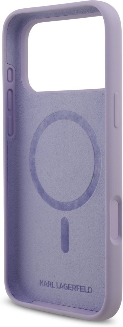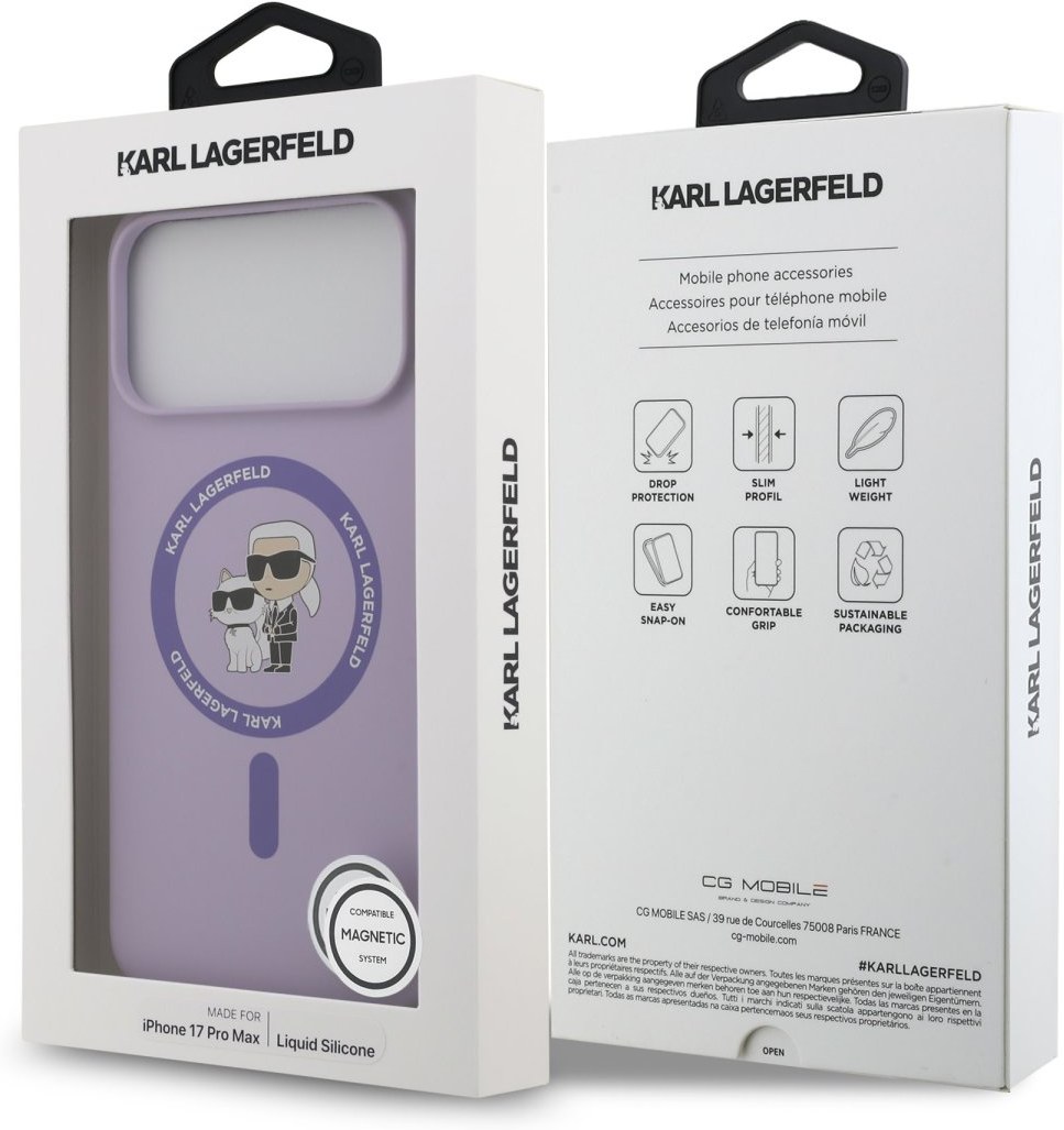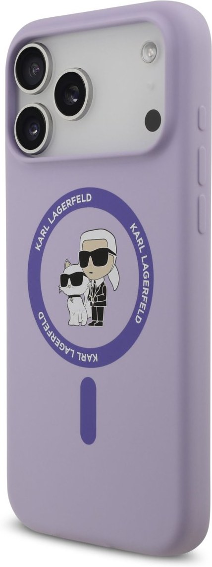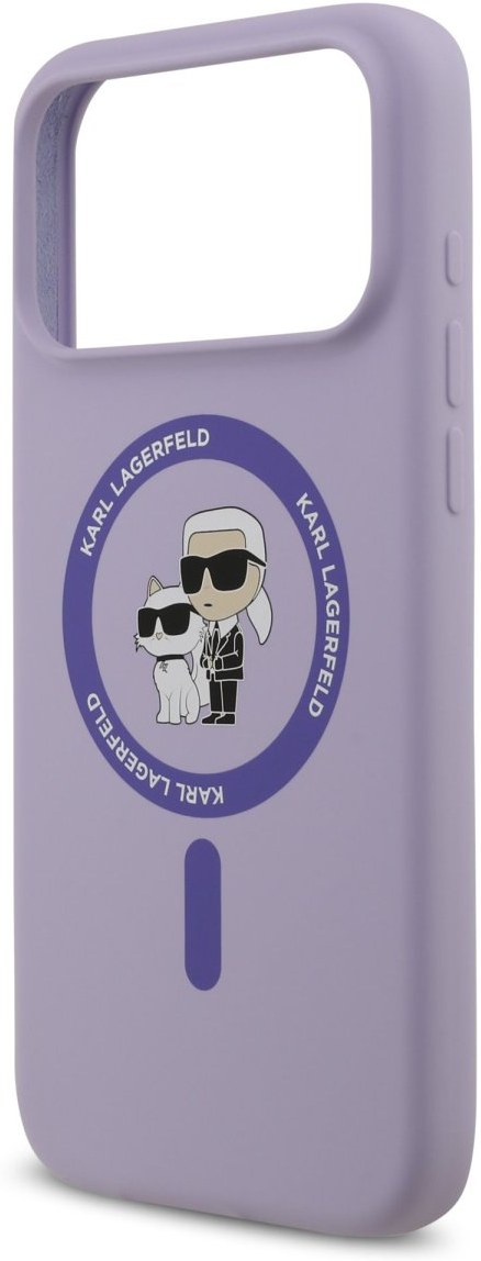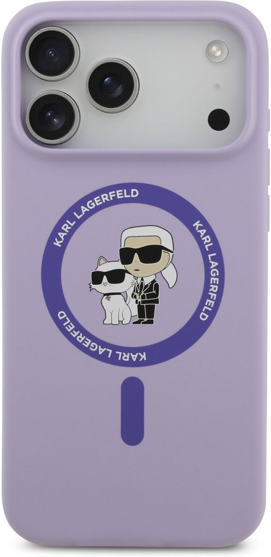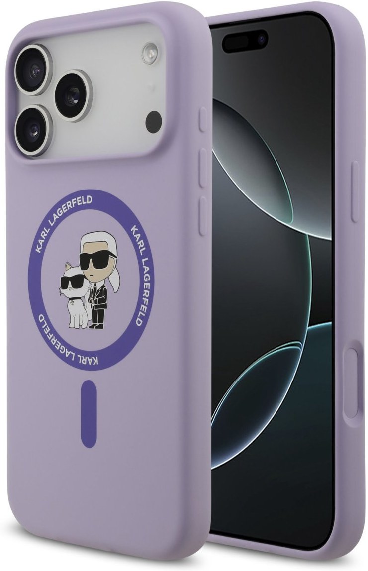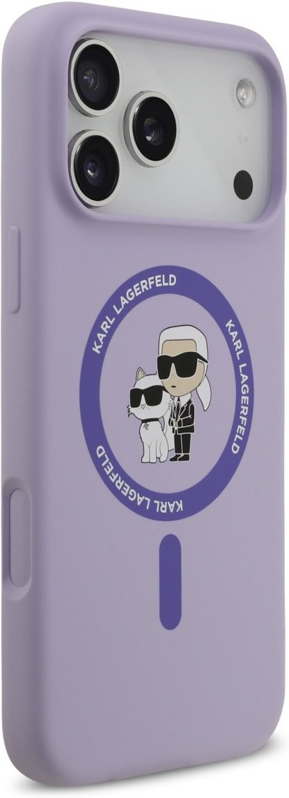 Karl Lagerfeld Liquid Silicone Karl and Choupette MagSafe kryt pre iPhone 17 Pro Max, fialový