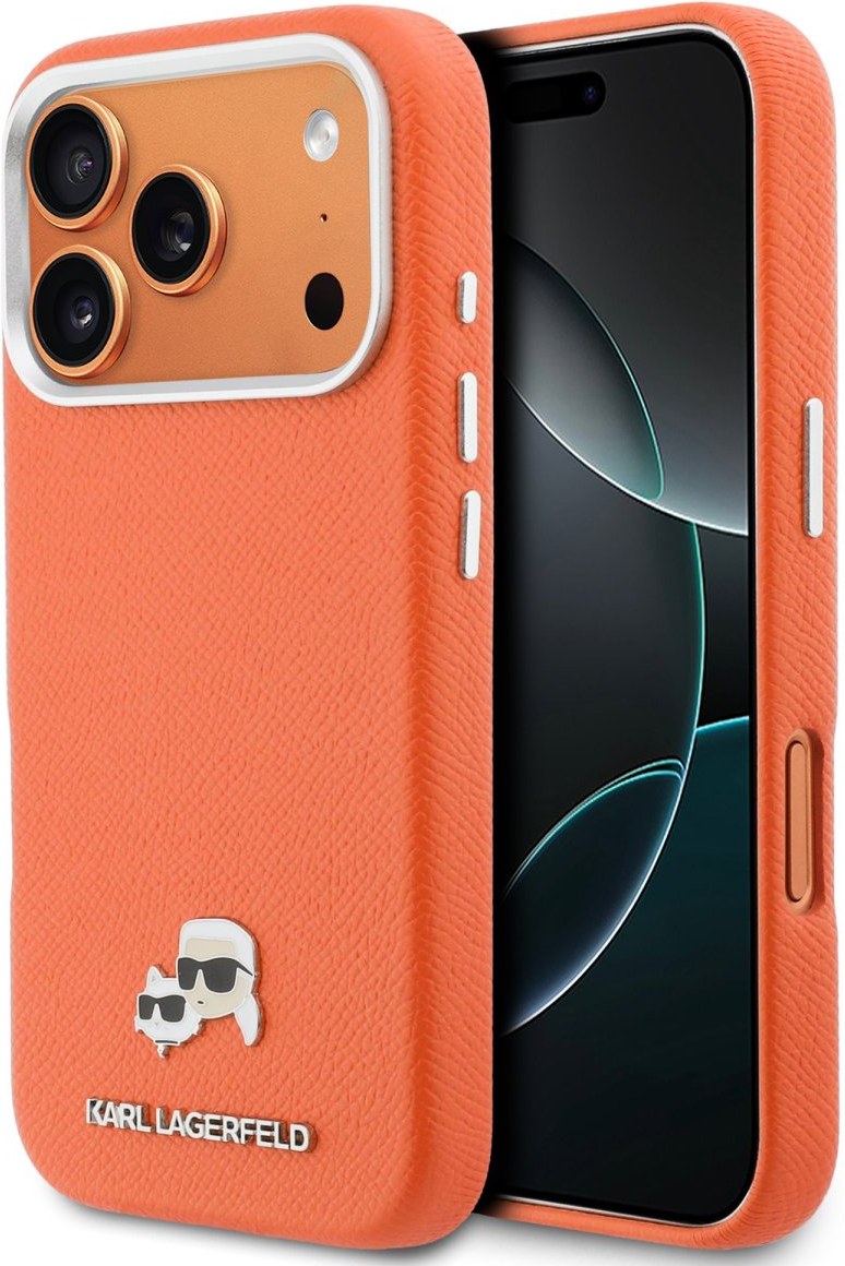 Karl Lagerfeld PU Karl and Choupette Heads Pins MagSafe kryt pre iPhone 17 Pro Max, oranžový