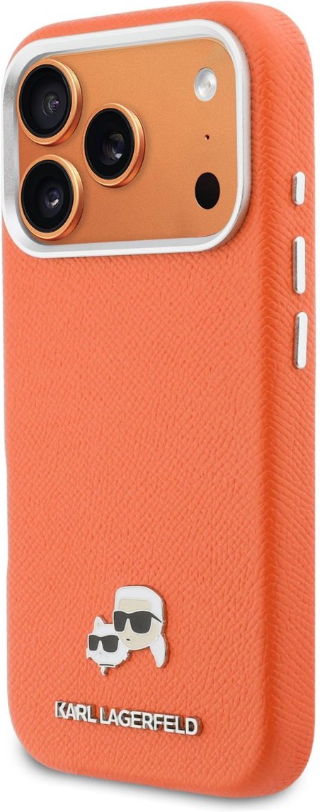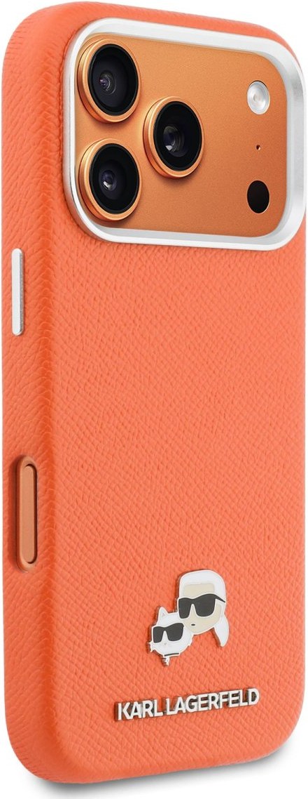 Karl Lagerfeld PU Karl and Choupette Heads Pins MagSafe kryt pre iPhone 17 Pro, oranžový