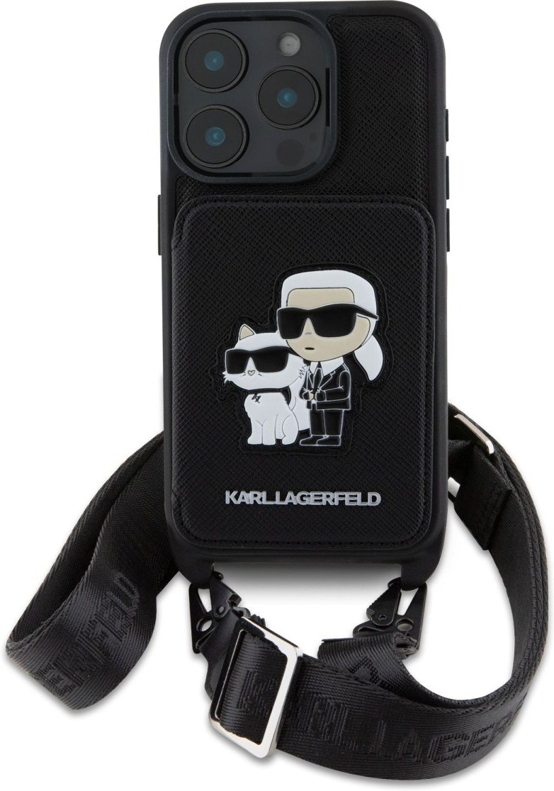 Karl Lagerfeld Saffiano Crossbody popruh Karl and Choupette kryt pre iPhone 16 Pro, čierny