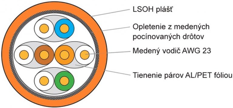 kábel s individuálne tienenými pármi AL/PET fóliou, spoločným tienením tvoreným opletením a LSOH plášťom