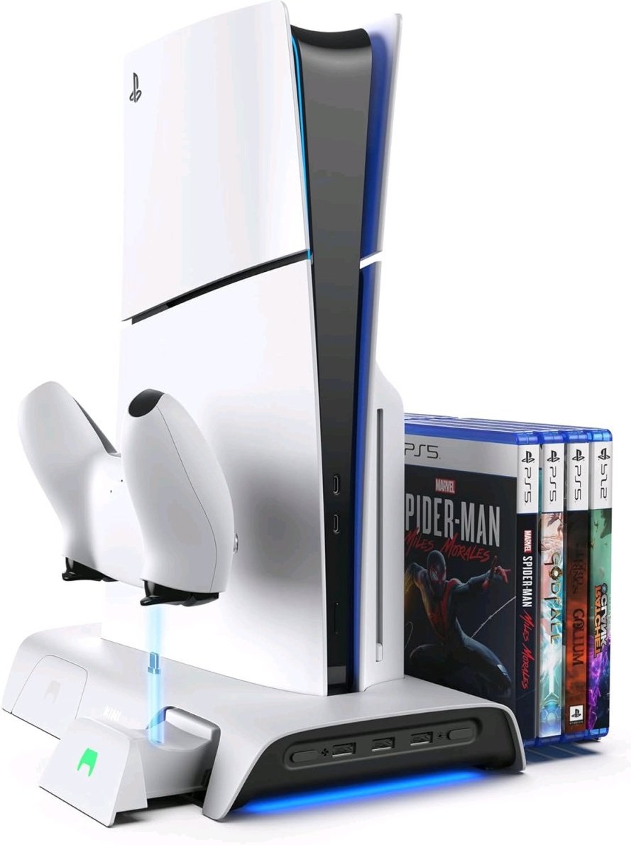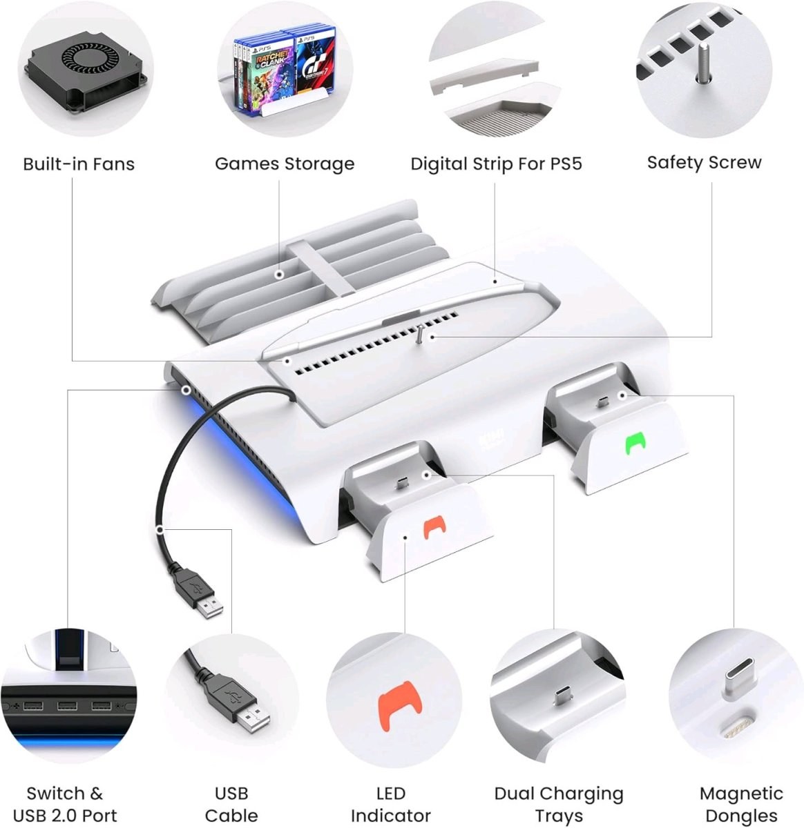Dizajn typu „všetko v jednom“ s funkciou stlačenia a zatiahnutia: Vstavaný sací chladič s turboventilátorom a 2 nastaviteľnými rýchlosťami, duálne nabíjacie priehradky a 8 herných priehradiek s funkciou stlačenia a zatiahnutia, 7 režimov RGB, 3 porty USB, kábel USB-C, 2 magnetické adaptéry skvelý darček pre milovníkov PS5 Slim.Vysokorýchlostné chladenie a systém automatického spúšťania