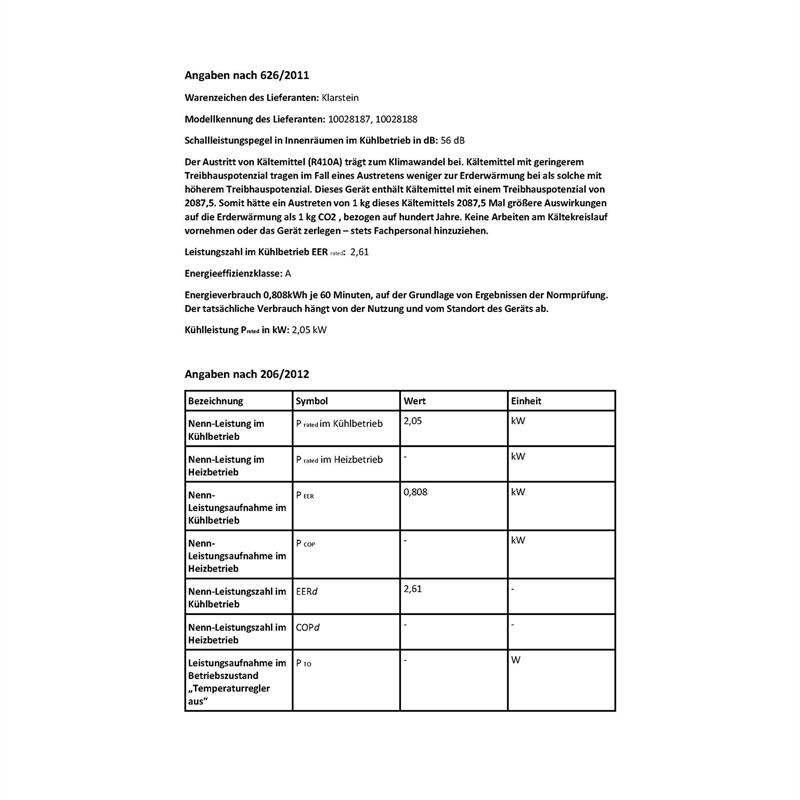 Klimatizácia Klarstein Pure Blizzard 3 2G sa postará o čistý, chladný vzduch v miestnosti v horúcich letných dňoch a s ventilátorom a odvlhčovačom zabezpečí príjemnú klímu v miestnosti. Zariadenie Klarstein boduje výkonným, ale úsporným kompresorom pre chladenie vzduchu. 7000 BTU, prípadne zodpovedajúcich 808 W, prináša zariadenie Pure Blizzard 3 2G do energetickej triedy A a je vhodné pre nepretržitú prevádzku.