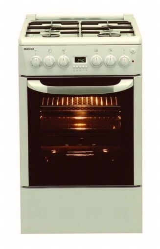 Kombinovaný sporák, 4 plynové horáky, smaltovaná mriežka, elektrické zapaľovanie v gombíku, multifunkčná rúra, gril, ventilátor, teplovzdušné výhrevné teleso, časový spínač, rozmery (vxšxh) 85x50x60 cmKombinovaný sporák