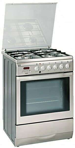 Kombinovaný sporák, energetická trieda A, 4 plynové horáky, elektrické zapaľovanie, elektronické hodiny s programovaním, gril, sklenený príklop, rozmery (vxšxh) 85x60x60 cmKombinovaný sporák