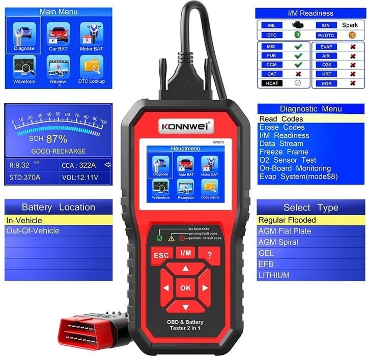 Konnwei KW870 podporuje aktuálne protokoly OBD II, takže na ňom môžete skontrolovať väčšinu vozidiel na trhu. Diagnostika je kompatibilná s väčšinou európskych, ázijských, amerických a austrálskych vozidiel s OBDII so 16-pinovou zásuvkou. Možno ju použiť pre benzínové aj naftové motory. Dokáže vymazať diagnostické chybové kódy (DTC) a resetovať stav OBD II. Dokáže vypnúť kontrolku motora (MIL) a určiť, akú poruchu indikuje. Dokáže tiež načítať informácie o vozidle, napríklad identifikačné číslo vozidla (VIN) . K dispozícii je aj živý prenos údajov, kde dokáže zobraziť napríklad aktuálnu rýchlosť, napätie, otáčky alebo dokonca teplotu motora. Môžete ho použiť na kontrolu porúch súvisiacich s emisiami vozidla (Freeze Frame). Pre automechanikov môže byť užitočný na kontrolu pripravenosti na I/M.Funkcia testovania batérie