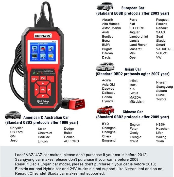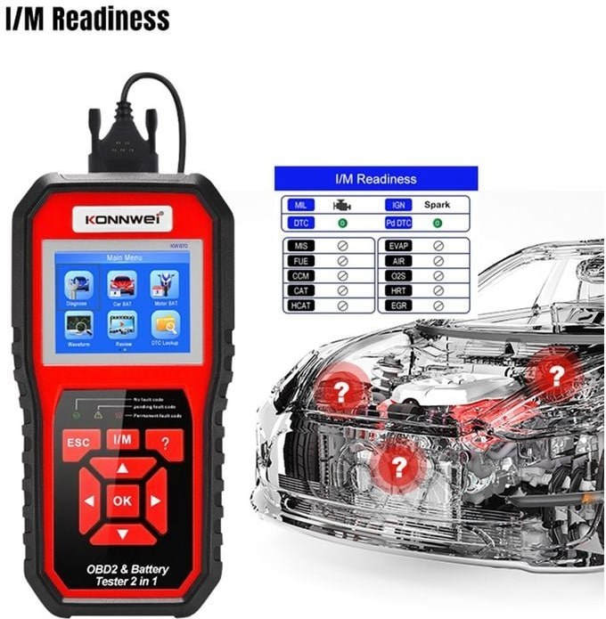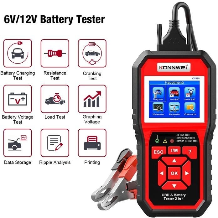 Konnvei KW870 je univerzálny diagnostický skener pre vozidlá OBDII a tiež tester batérií pre automobily a motocykle. Tento prístroj v sebe spája funkcie diagnostiky OBDII a testovania batérie, vďaka čomu je výnimočným a praktickým pomocníkom pre všetkých motoristov.Kúpou tohto diagnostického prístroja ušetríte peniaze za vykonávanie každej bežnej diagnostiky vozidla v autoservise, ktorú si teraz budete môcť ľahko vykonať sami. Častejšou kontrolou navyše môžete lepšie predísť vážnejšej poruche motora vozidla, ktorej odstránenie by mohlo byť veľmi nákladné. Máte tiež možnosť odhaliť technické poruchy ojazdeného vozidla ešte pred jeho kúpou.