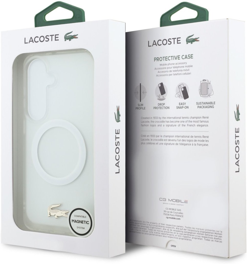 Lacoste PC/TPU Frosted Finish Gold Logo Magnetic Zadný Kryt je tu, aby tvoj iPhone nielen chránil, ale aj podčiarkol svoj štýl a prémiový vzhľad. Kryt je vyrobený z kombinácie odolného PC plastu a flexibilného TPU, čo zaisťuje ideálnu rovnováhu medzi ochranou a pohodlím pri používaní. Ponúka spoľahlivú ochranu proti pádom, poškriabaniu a každodenným nárazom, pričom dokonale sedí na telefóne a umožňuje ľahký prístup ku všetkým tlačidlám a konektorom. Dizajn krytu je elegantný a moderný: matný „frosted finish“ povrch podčiarkuje zlaté logo krokodíla a zlatý rám okolo zadných fotoaparátov, čím dodáva telefónu luxusný vzhľad. Tento model je vybavený magnetickou funkciou, ktorá umožňuje ľahké a bezpečné uchytenie k magnetickým držiakom – napríklad v aute. Magnet vo vnútri krytu drží pevne bez toho, aby narušoval signál alebo funkčnosť zariadenia, a pritom zachováva štíhly profil celého puzdra. Ide tak o praktické riešenie pre každého. Pokiaľ hľadáte kombináciu elegancie, ochrany a praktickosti, tento kryt od Lacoste je ideálnou voľbou.Kľúčové vlastnosti