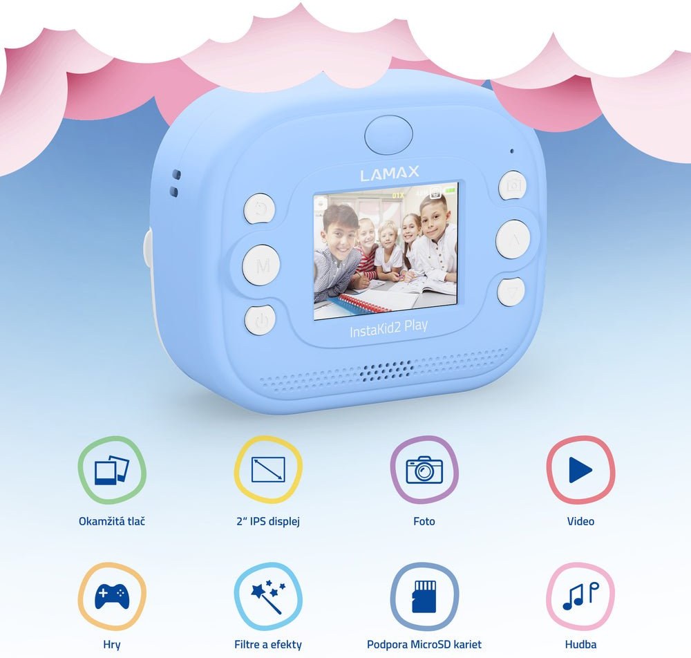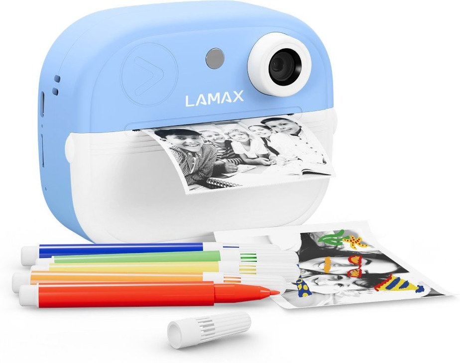 LAMAX InstaKid2 Play je foťák, ktorý nestráca čas. Deti si s ním jednoducho zaznamenajú každý dôležitý moment a počas sekundy ho majú v ruke. Čiernobiele snímky sa môžu premeniť na farebné spomienky pomocou fixiek, ktoré sú súčasťou balenia – stačí ich len vyfarbiť, pridať do vlastného albumu alebo nimi potešiť napríklad babičku. Vďaka jednoduchému ovládaniu, dvom roličkám v balení (vrátane samolepiacej), originálnemu dizajnu a výkonnej kamere so 48 Mpx a FullHD videom, sa foťák stane nepostrádateľným spoločníkom na výlety, oslavy aj tvorivá popoludní s kamarátmi. Obľúbia si ho aj staršie deti, ktoré si môžu svoje snímky aj videá ukladať na microSD kartu a uchovať si tak svoje prvé filmárske pokusy. Na výber je ružová alebo modrá varianta a nechýba ani praktická šnúrka na krk, aby mali deti foťák stále po ruke. A keď práve nefotí? Zábavu zaistí päť hier priamo vo fotoaparáte. Tento foťáčik totiž nie je len o spomienkach, je tiež o radosti, seba vyjadrení a fantázii.Technológia InstaThermal® prináša okamžitú tlač čiernobielych fotografií priamo z vášho fotoaparátu – bez atramentu, bez chemikálií a bez čakania. Špeciálny termopapier reaguje na precízne zahriatie a v priebehu pár sekúnd vykreslí ostrý, suchý a odolný obrázok.