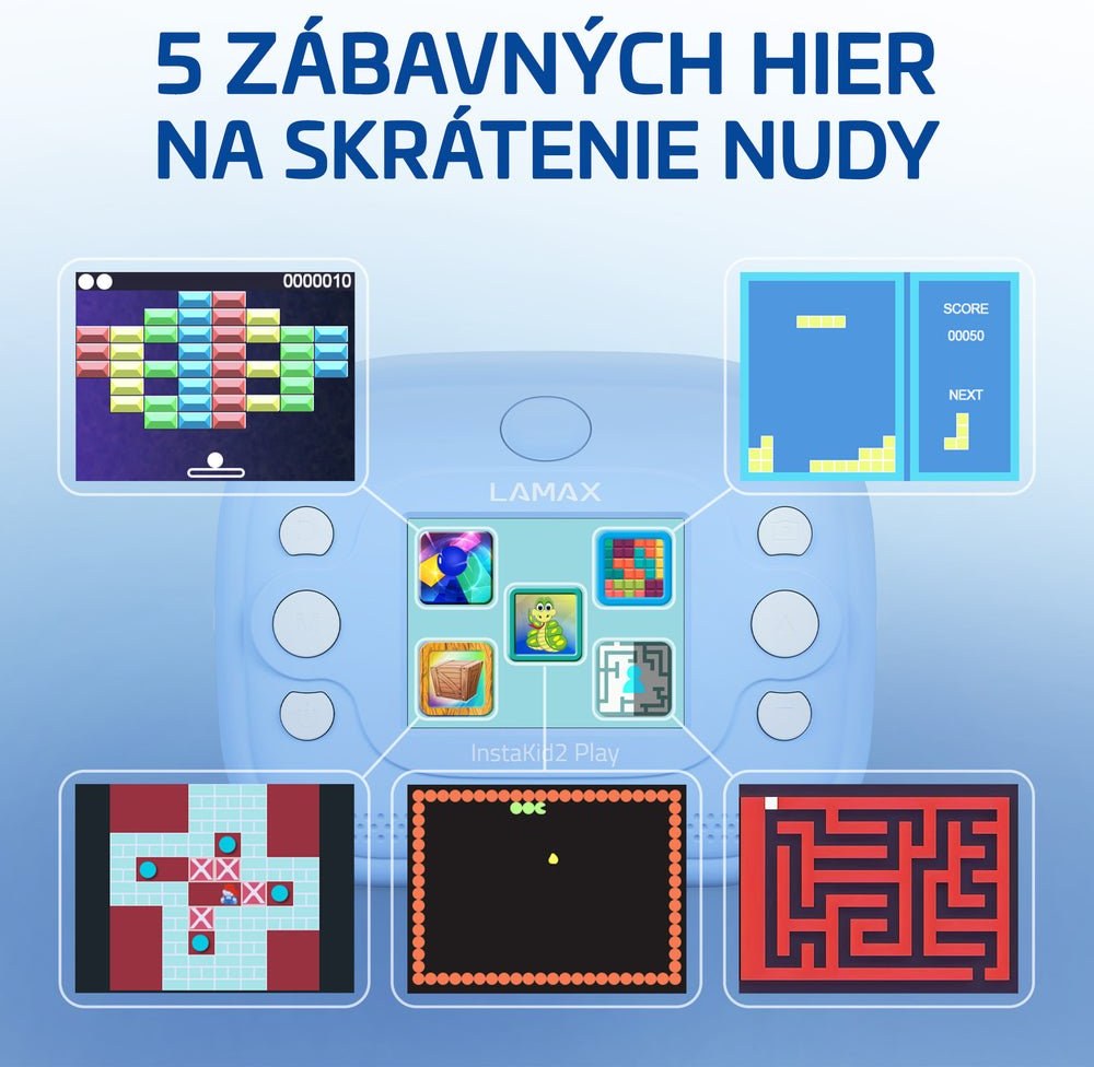 V balení s fotoaparátom LAMAX InstaKid2 Play nájdete aj farebné fixy, vďaka ktorým si deti môžu svoje výtvory dozdobiť podľa vlastnej fantázie a každá snímka sa tak stáva osobitým dielom. A keď si malí tvorcovia potrebujú od fotenia na chvíľu oddýchnuť, čaká ich zábava v podobe piatich jednoduchých hier priamo vo fotoaparáte. Či už sa hrajú na malého fotografa alebo začínajúceho režiséra, možnosti zábavy s týmto prístrojom neberú konca.Okamžitá tlač spomienok