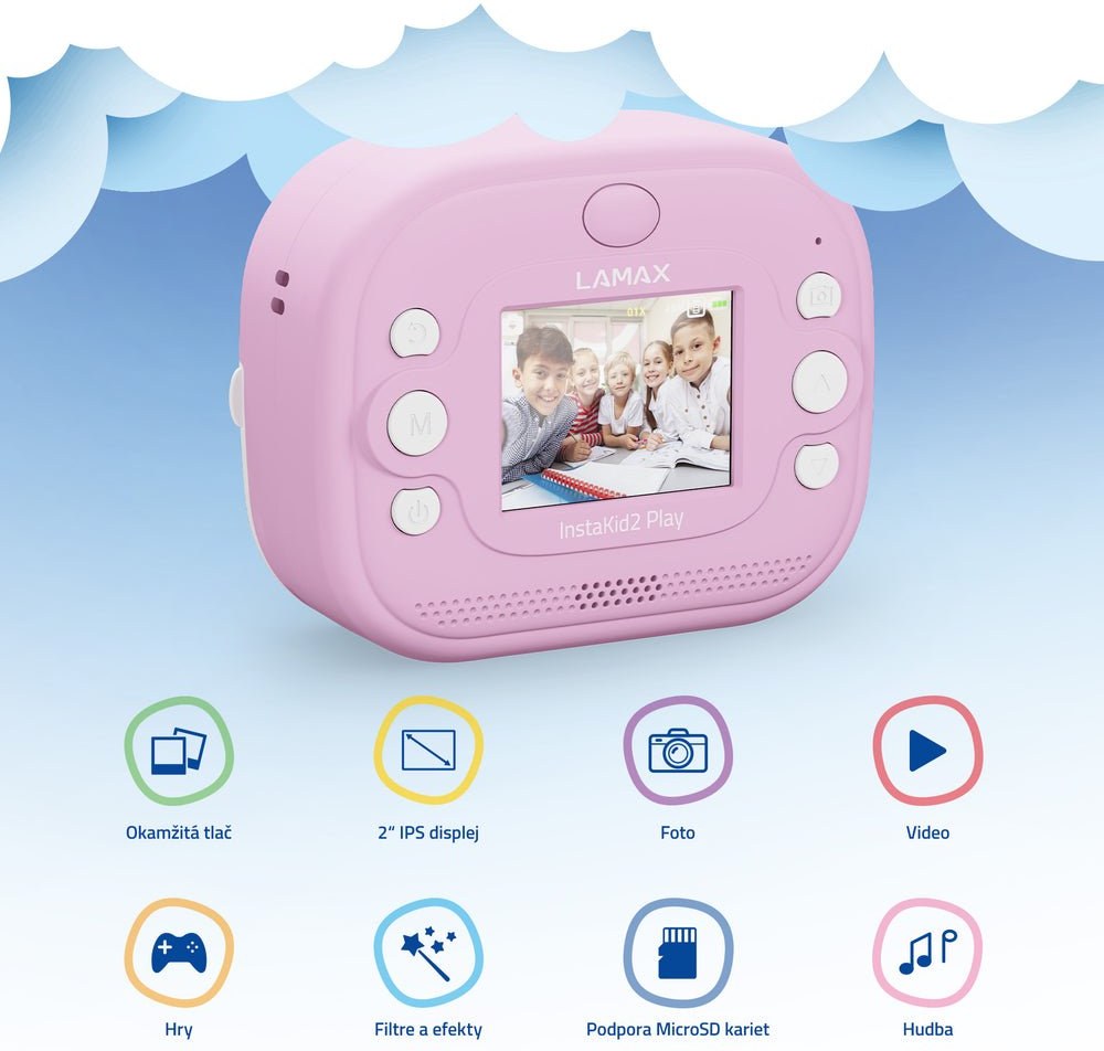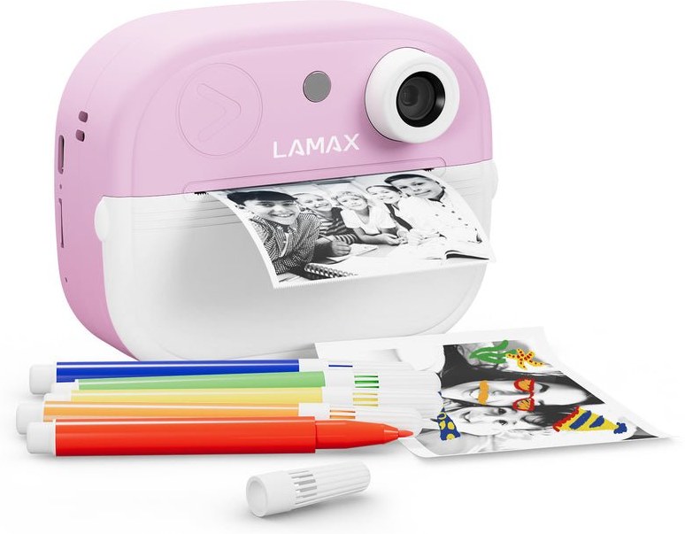 LAMAX InstaKid2 Play je foťák, ktorý nestráca čas. Deti si s ním jednoducho zaznamenajú každý dôležitý moment a počas sekundy ho majú v ruke. Čiernobiele snímky sa môžu premeniť na farebné spomienky pomocou fixiek, ktoré sú súčasťou balenia – stačí ich len vyfarbiť, pridať do vlastného albumu alebo nimi potešiť napríklad babičku. Vďaka jednoduchému ovládaniu, dvom roličkám v balení (vrátane samolepiacej), originálnemu dizajnu a výkonnej kamere so 48 Mpx a FullHD videom, sa foťák stane nepostrádateľným spoločníkom na výlety, oslavy aj tvorivá popoludní s kamarátmi. Obľúbia si ho aj staršie deti, ktoré si môžu svoje snímky aj videá ukladať na microSD kartu a uchovať si tak svoje prvé filmárske pokusy. Na výber je ružová alebo modrá varianta a nechýba ani praktická šnúrka na krk, aby mali deti foťák stále po ruke. A keď práve nefotí? Zábavu zaistí päť hier priamo vo fotoaparáte. Tento foťáčik totiž nie je len o spomienkach, je tiež o radosti, seba vyjadrení a fantázii.Technológia InstaThermal® prináša okamžitú tlač čiernobielych fotografií priamo z vášho fotoaparátu – bez atramentu, bez chemikálií a bez čakania. Špeciálny termopapier reaguje na precízne zahriatie a v priebehu pár sekúnd vykreslí ostrý, suchý a odolný obrázok.