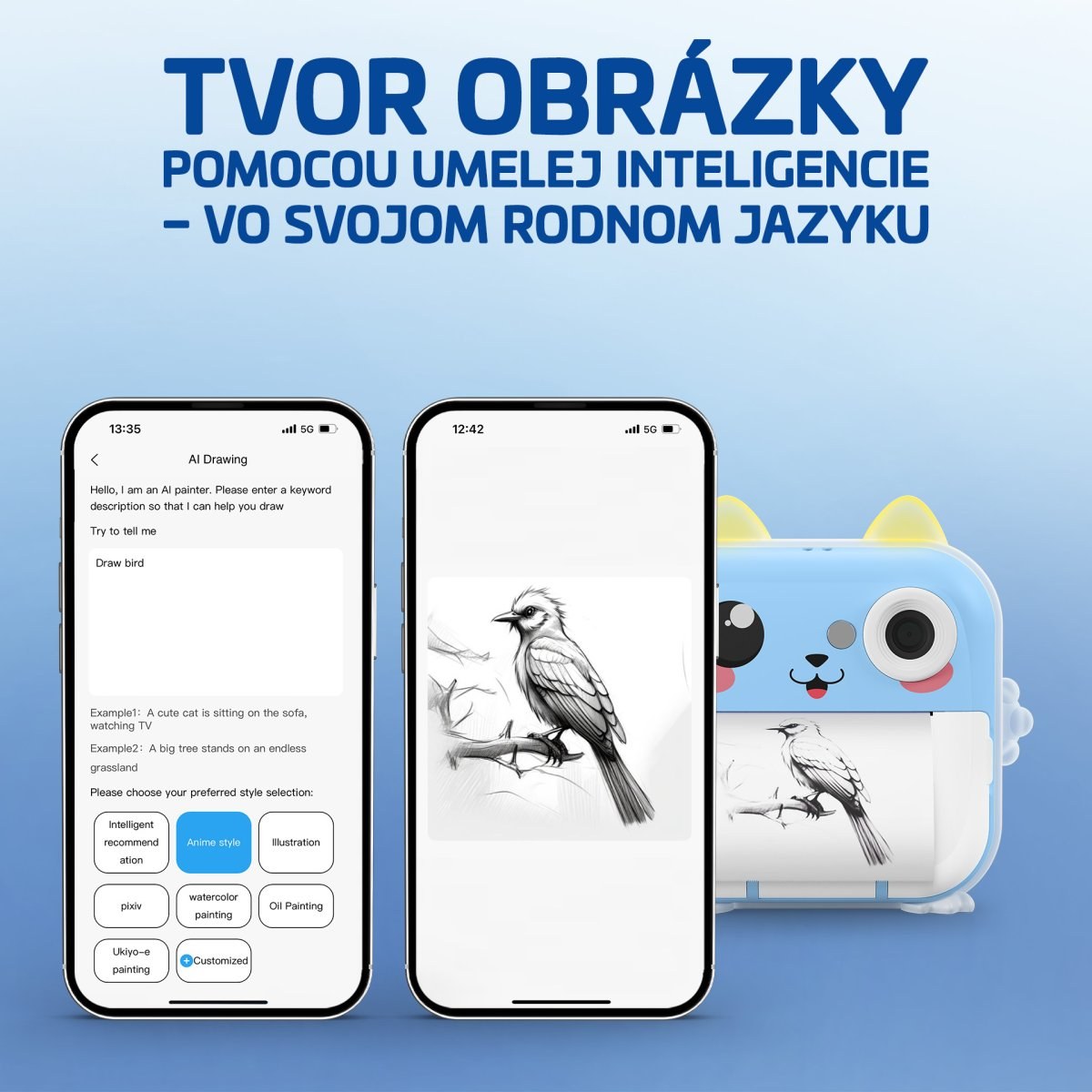 Foťák je prepojený so šikovnou aplikáciou v slovenčine, takže jeho ovládanie zvládnu aj menšie deti. Aplikácia toho ale vie oveľa viac. Okrem tlače fotiek, poznámok alebo samolepiek priamo z telefónu zvláda aj skenovanie ručne písaných zápiskov, preklady textov z obrázkov, AI vyfarbovanie, tvorbu obrázkov pomocou umelej inteligencie alebo prevod fotografií do animovaného štýlu. Stačí pár kliknutí a deti si samy vytvoria obrázky presne podľa svojej predstavivosti.