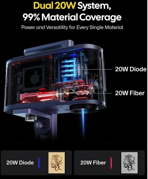 Extrémne rýchlosti gravírovania až do 10 000 mm/s na bleskovú sériovú výrobu.Duálny laserový systém (20 W vlákno + dióda)na prácu s kovmi, drevom, plastmi a kožou.