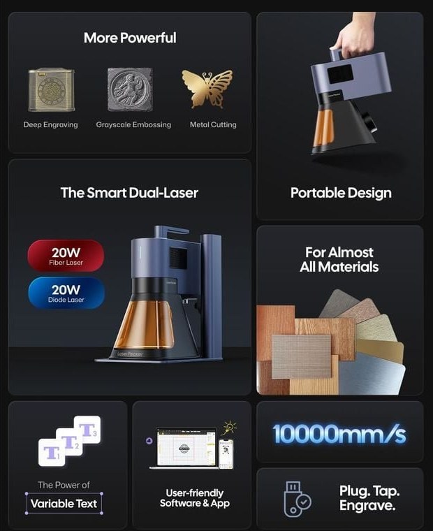 S LaserPecker 5 Basic Version, najrýchlejším prenosným duálnym laserom na svete, premeníte svoju kreativitu na prosperujúce podnikanie. Tento výkonný nástroj kombinuje profesionálnu presnosť s nevídanou rýchlosťou, takže je ideálny na okamžitú zákazkovú výrobu v dielni a na stavbe.Kľúčové vlastnosti