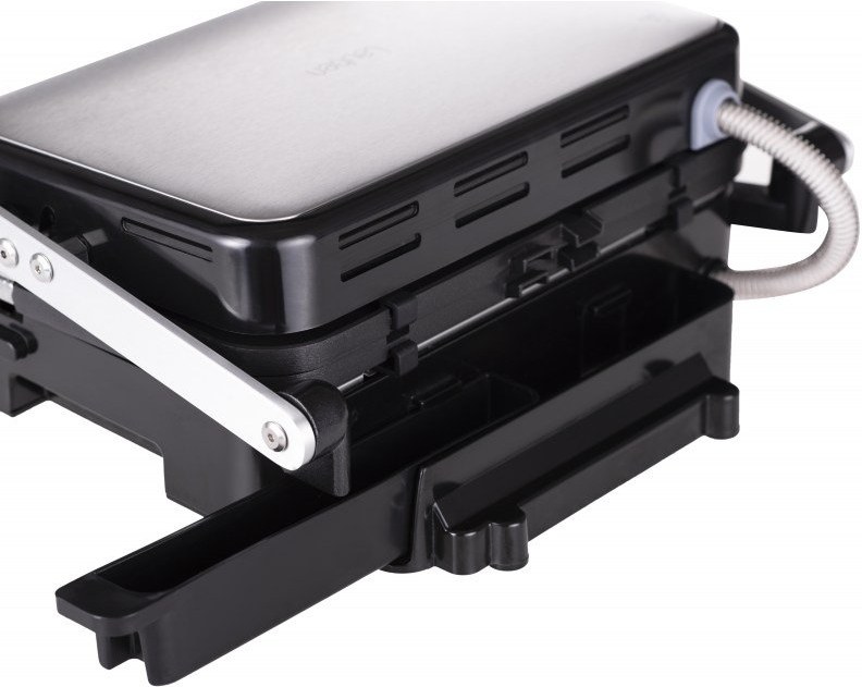 Kontaktný gril na zapekanie, ktorý po uvedení do vodorovnej polohy pretvoríte na plnohodnotný stolný gril s plochou 1400 cm2.