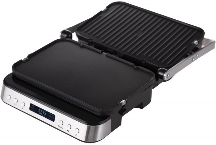 180° otvorenie, grilovacia plocha 1400 cm2, 6 automatických programov, užívateľské nastavenie a pamäte, vyberateľné platničky - v balení ploché a grilovacie