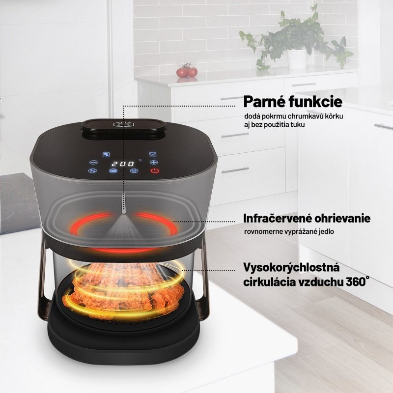 sklenený fritovací kôš, parné funkcie, infračervené svetlo, osvetlenie interiéru, 8 programov, manuálne nastavenie času aj teploty, digitálne ovládanie s displejom, nastaviteľná teplota od 60 -200 °C, nastaviteľný čas 0 - 60 min