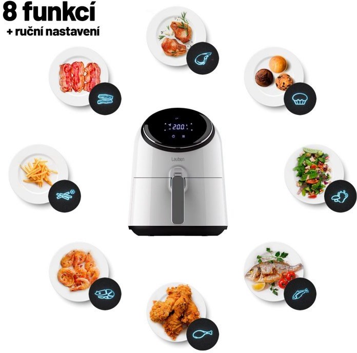 Pri príprave jedla s fritézou Lauben máte na výber z 8 režimov, ktoré sú ušité na mieru konkrétnym surovinám. Vyberať môžete z týchto režimov – hranolky, slanina, kuracie paličky, krevety, steak, sladké pečivo, zelenina alebo ryby. Ak si nevyberiete, je možné si nastaviť požadovanú teplotu a dobu smaženia podľa vlastných preferencií. Výsledkom vždy budú rovnomerne osmažené suroviny s chrumkavým finišom. Potraviny môžete do fritézy vložiť ihneď po zapnutí, na nič nečakáte.