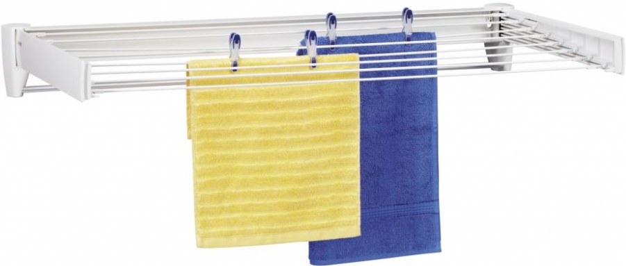 nástenný kúpeľňový sušiak, skladací, šetrí miesto, 8 m sušiace plochy, šírka tyčí 100 cm, samostatný chrómovaný vešiak na osušky, biela, modráhttp://www.leifheit.co.uk/