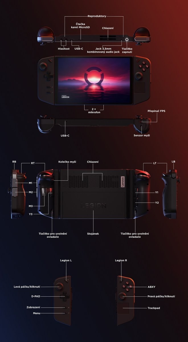 Lenovo Legion Go sa môže pochváliť aj nádherným 8,8" dotykovým displejom s vysokým rozlíšením 1600 × 2560 pixelov a 144 Hz obnovovacou frekvenciou, ktorá zabezpečuje ostrý a živý obraz bez oneskorenia. Jas až 500 nitov zaručuje perfektnú čitateľnosť aj na priamom slnku. Konzola má tiež integrovaný stojan, ktorý umožňuje nastaviť si optimálny uhol pohľadu. Pod kapotou sa skrýva procesor AMD Ryzen Z1 Extreme s grafikou AMD RDNA, ktoré zvládnu aj najnáročnejšie AAA tituly na špičkové detaily. Navyše má 16 GB RAM LPDDR5X s neuveriteľným taktom 7 500 MHz, rovnako ako superrýchlym úložiskom 512 GB PCIe Gen 4 s možnosťou rozšírenia o microSD kartu (až 2 TB).
