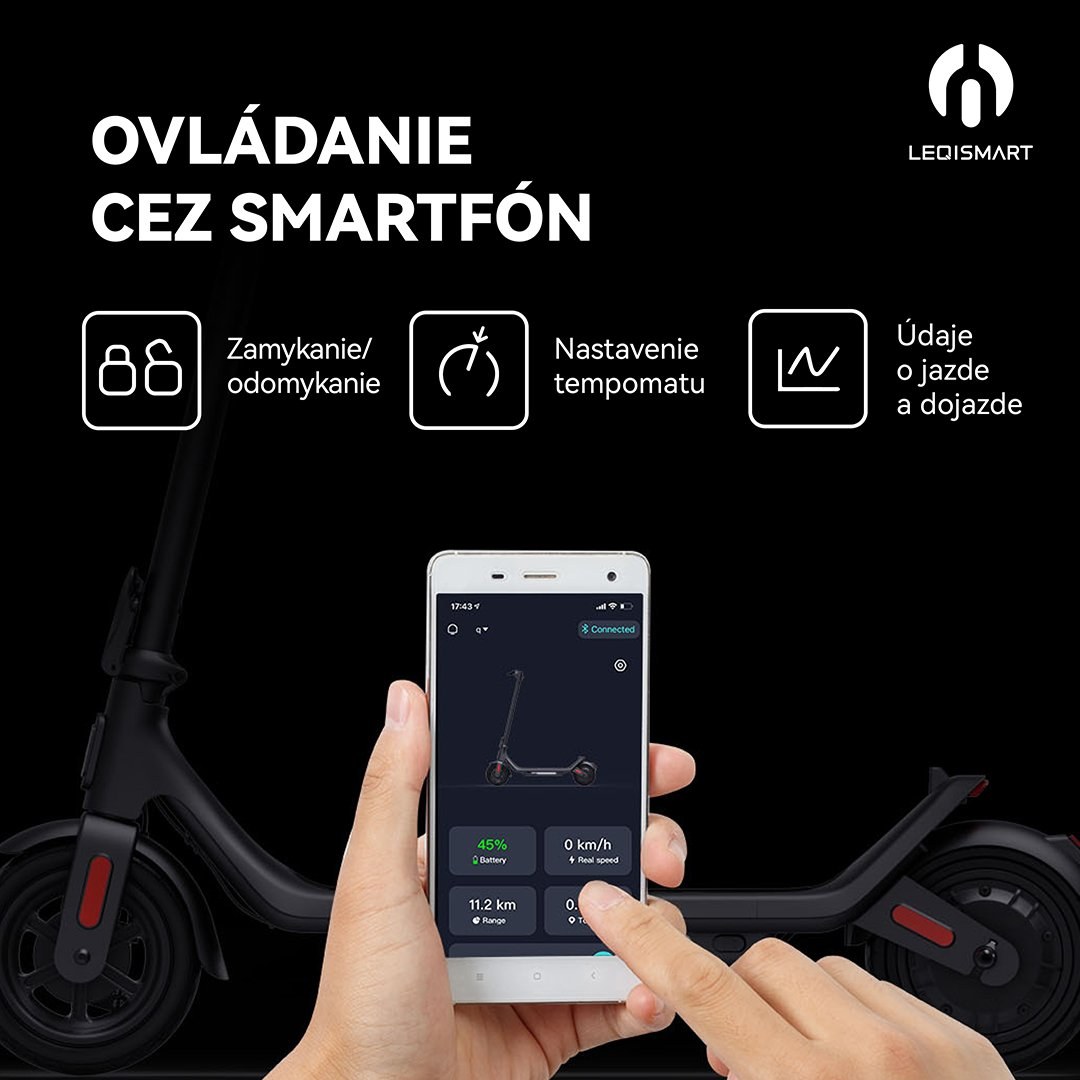 LEQI A6S Pro ponúka 3 jazdné režimy – úsporný (6 km/h), normálny (15 km/h) a rýchly (25 km/h), medzi ktorými môžete jednoducho prepínať. Kolobežka je vybavená LED displejom na riadidlách, ktorý zobrazuje aktuálnu rýchlosť, stav batérie a ďalšie údaje. Pomocou Bluetooth ju môžete prepojiť so smartfónom a cez aplikáciu Leqismart sledovať štatistiky jazdy, ovládať tempomat, zamykať kolobežku či aktualizovať softvér.