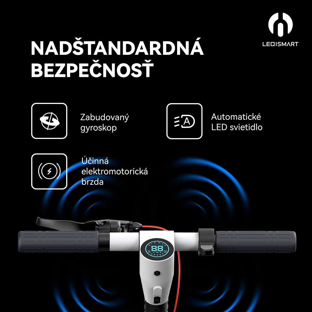 LEQI A6S Pro kladie dôraz na bezpečnosť jazdy. Je vybavená gyroskopom, ktorý automaticky obmedzí výkon motora pri nebezpečnom náklone alebo strate kontaktu zadného kolesa s vozovkou. O krátku brzdnú dráhu sa stará kombinácia elektromotorickej a bubnovej brzdy. V noci vás ochráni automatické predné LED svetlo, zadné brzdové svetlo a štýlové bočné LED osvetlenie, ktoré bliká pri odbočovaní.