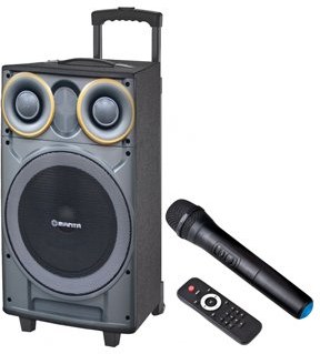 SPK5003 Ghul je karaoke reproduktor vhodný pre akúkoľvek párty. Set je uzavretý v kompaktnom prenosnom puzdre s kolieskami a držadlom. Vstavané reproduktory: 12-palcový stredobas, 5" tweeter, napájanie: AC 230V ~ 50Hz, vstavaná batéria, Rozmery (ŠxVxH): 381 x 300 x 625mm, hmotnosť: 13,6kg, konektory: 6,3mm jack (gitara + mikrofón), USB, SD, AUX IN, displej: LED, Ďalšie vlastnosti: LED Disco svetlo, nahrávanie, diaľkové ovládanie, mikrofón, Zvláštnosti: MP3 Super Bass Equalizer, Vstavaná batéria: Áno, 4,5 Ah