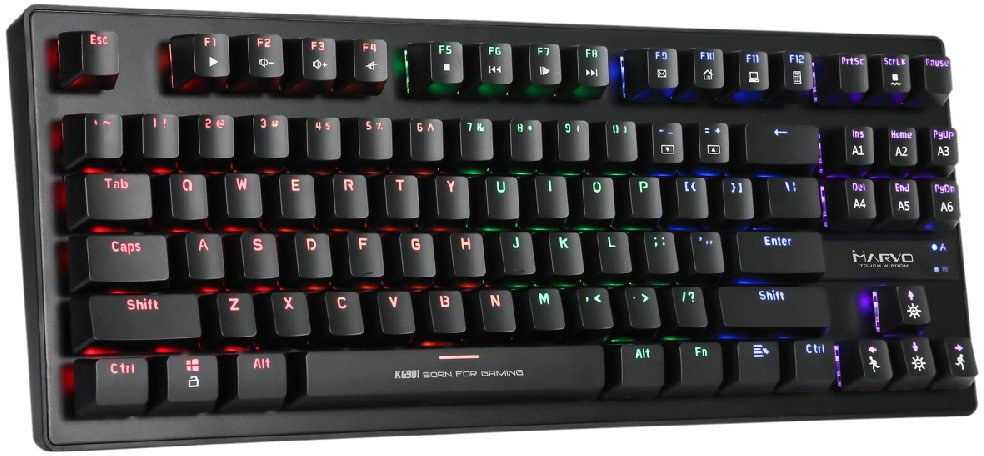 Klávesníca MARVO KG901 disponuje modrými mechanickými spínačmi, kompaktným prevedením a tenkým okrajom, čím šetrí miesto na stole. Napriek menšiemu rozmeru ponúka to, čo ocení každý hráč a plusom je CZ/SK rozloženie kláves.