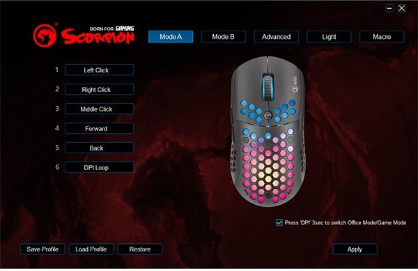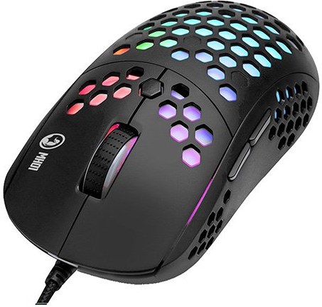 Herná myšVeľkou výhodou tejto hernej myši je jej hmotnosť. Vďaka perforovaného designu pripomínajúci včelí plást, ktorý dodáva myši taktiež jedinečnosť, je váha iba 76 g. Preto s ňou je možné behom hrania ľahšie manipulovať. Pri dlhodobej práci a hrách nebudete pociťovať únavu. Ergonomický tvar zaisťuje podporu dlane, čo je jej veľkou výhodou. Oku bude lahodiť RGB podsvietenie.