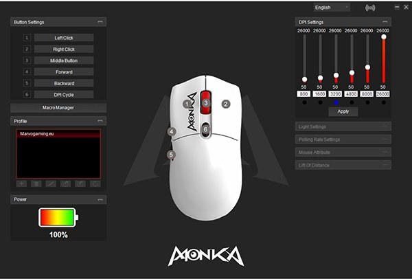 Prepracovaný software vám umožní posunúť herný zážitok na novú úroveň. Intuitívne rozhranie uľahčuje navigáciu a umožňuje s ľahkosťou programovať tlačidlá, nastavovať RGB podsvietenie, naprogramovať makra a ukladať si vlastné profily. Prideľte ľubovoľnému tlačidlu myši ľubovoľnú funkciu, makro alebo kombináciu kláves. Vyberte si zo širokej škály RGB 16,8 miliónov farieb a 7 svetelných efektov, aby ste prispôsobili vzhľad myši vašemu hernému setupu. Vytvárajte komplexné makra pre opakujúce sa akcie a zefektívnite tak svoj herný štýl. Uložte si rôzne nastavenia pre rôzne hry alebo používateľov a prepínajte medzi nimi iba kliknutím. Software Monka vám dáva absolútnu kontrolu nad vašou myšou.Ľahká ako pierko