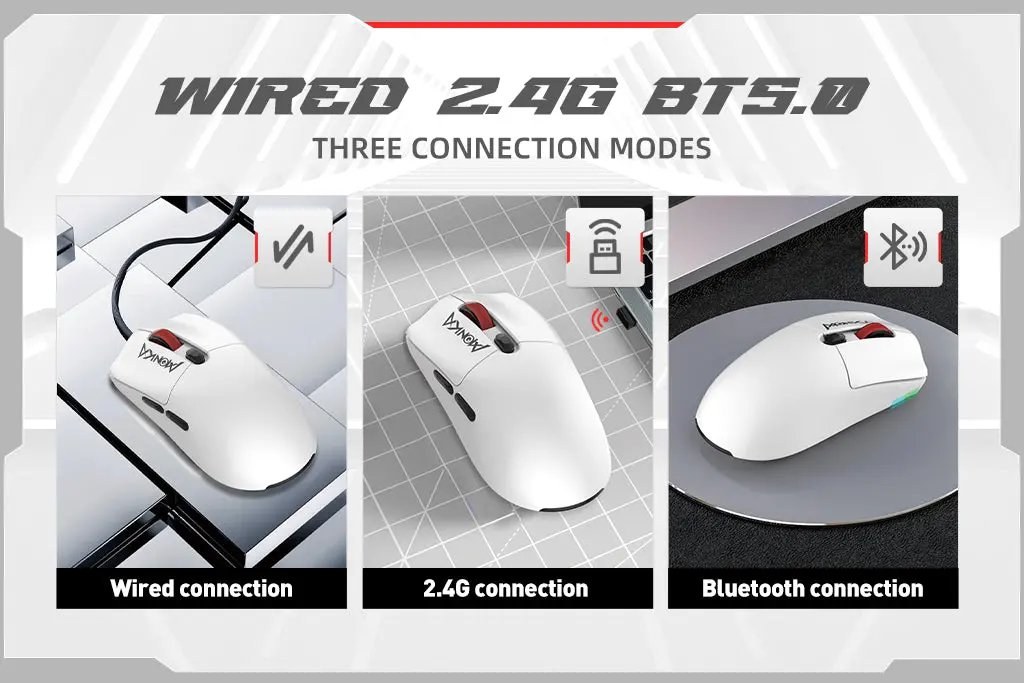Kábel, 2.4 GHz alebo Bluetooth? Myš G995 možno pripojiť všetkými spôsobmi. Nenechajte sa obmedzovať dĺžkou kábla a rozbehnite svoje hry na plné obrátky. Bezdrôtové pripojenie či už cez USB prijímač alebo Bluetooth 5.2 ponúka dosah až 10 metrov a môžete sa tešiť až na 40 hodín hrania na jeden nádych. Že veríte skôr klasickému pripojeniu cez kábel? Ani to nie je pre myš Monka žiadny problém. Súčasťou balenia je veľmi odolný opletaný 1,6 m dlhý USB-C kábel. Túto myš skrátka neprekvapí žiadny operačný systém - zvláda Windows, MAC, iOS aj Android.Bez softwaru ani ranu