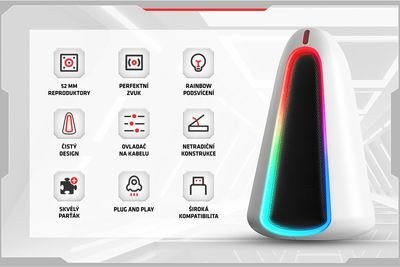 Monka SG-500 zaujmú nie len svojim kvalitným zvukom, ale aj elegantným a moderným designom. Čisté a decentné línie dopĺňa jemné rainbow podsvietenie umiestnené okolo reproduktorových membrán, ktoré dodáva slúchadlám štýlový vzhľad a podtrhne hernú atmosféru. Pre maximálne pohodlie a komfort je ovládač reproduktorov umiestnený priamo na kábli. Vďaka tomu ho máte vždy po ruke a ľahko tak môžete ovládať napájanie reproduktorov, podsvietenie a hlasitosť zvuku. Na spodnej strane reproduktorov sa nachádzajú protišmykové podložky, ktoré zaisťujú stabilné umiestnenie a zároveň znižujú rezonanciu. To prispieva ku dokonalej kvalite zvuku, ktorá vás pohltí a nenechá vás sa odtrhnúť od hry, filmu alebo hudby.Základná špecifikácia: