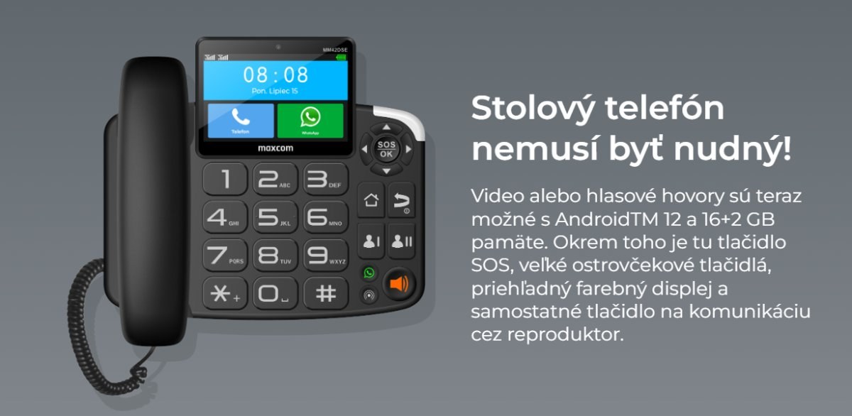 Stolový telefón nemusí byť nudný! Android™ 12 a 16+2 GB pamäte, plus tlačidlo SOS, veľmi veľké tlačidlá, jasný farebný displej a samostatné tlačidlo na komunikáciu cez reproduktor.Snívate o stolnom telefóne plnom zaujímavých funkcií?