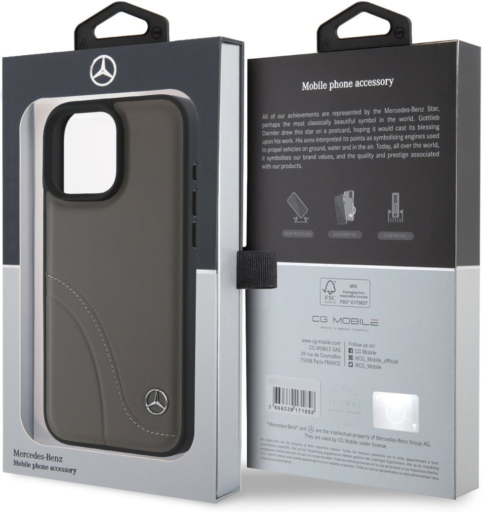 Mercedes Curved Stitches Leather prémiový kryt vyrobený z kombinácie odolného a pružného PU na zadnej strane potiahnutého pravou kožou. Boky krytu sú z pružného PU materiálu v čiernej farbe. Uľahčujú inštaláciu krytu a spoľahlivo chránia telefón pred otrasmi a poškodením. Dominantným rysom tejto kolekcie je jemný reliéf na zadnej strane puzdra, ktorá je vyrobená z pravej kože. Štruktúra je zvýraznená precíznym prešitím nylonovou niťou vedeným pozdĺž jeho línií. Tieto detailne spracované prvky prirodzene pútajú pozornosť a dodávajú puzdru sofistikovaný a elegantný vzhľad. Celkový dojem završuje decentné kovové logo Mercedes-Benz, ktoré je symbolom kvality, štýlu a autenticity. Kryt poskytuje skvelú ochranu pre váš telefón a to ako na chrbte, tak aj na bokoch, ktoré sú tou najkrehkejšou časťou telefónu. Samozrejmosťou je, že všetky tlačidlá aj konektory sú plne prístupné. Decentný vzhľad s kovovým logom Mercedes ako prémiový doplnok nielen vášho outfitu.Vlastnosti