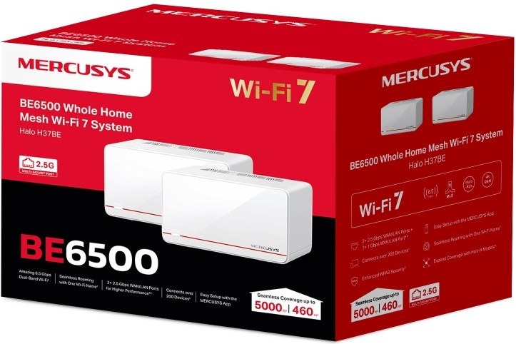 Mercusys Halo H37BE (2-pack) prináša do domácností najnovší štandard Wi-Fi 7, ktorý poskytuje špičkovú rýchlosť, vyššiu kapacitu siete a nižšiu latenciu. Využíva široké 160 MHz kanály, moduláciu 4K-QAM a technológiu Multi-Link Operation (MLO), vďaka čomu dosahuje kombinovanú rýchlosť až 6,5 Gbps. To umožňuje bezproblémové prehrávanie 4K/8K videí, plynulé AR/VR hranie aj ultrarýchle sťahovanie veľkých súborov.
