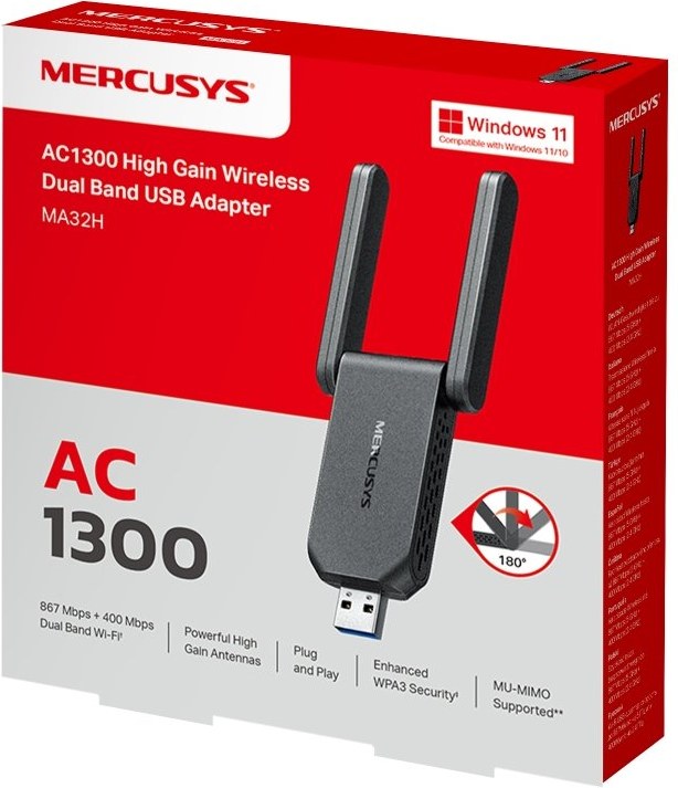 Mercusys MA32H je výkonný Wi-Fi USB adaptér, ktorý poskytuje rýchle a stabilné bezdrôtové pripojenie pre stolné počítače a staršie notebooky bez vstavaného Wi-Fi modulu. Vďaka podpore štandardu 802.11ac (Wi-Fi 5) ponúka až 3× vyššiu rýchlosť než predchádzajúce generácie. Adaptér pracuje v duálnom pásme – 2,4 GHz s rýchlosťou až 400 Mb/s a 5 GHz s rýchlosťou až 867 Mb/s, čo zaručuje plynulé streamovanie, hranie online hier a rýchle sťahovanie súborov.