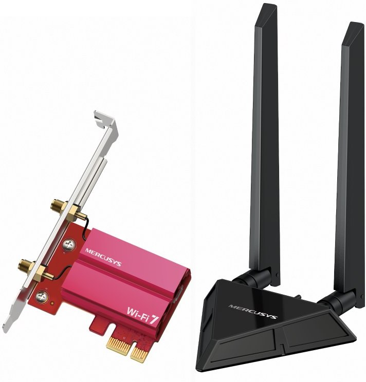 WiFi sieťová karta, rozhranie PCIe, max. rýchlosť prenosu 9,3 Gb/s, WiFi 7 - 802.11be, 6 GHz rýchlosť 5765 Mb/s, 2,4 GHz rýchlosť 688 Mb/s, 5 GHz rýchlosť 2882 Mb/s, vonkajšia anténaZobraziť viac