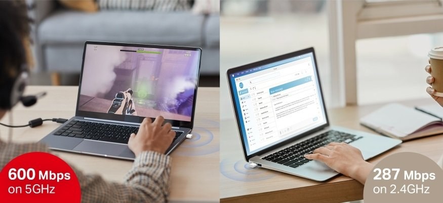 Zariadenie podporuje duálne pásmo Wi-Fi – 2.4 GHz s rýchlosťou až 287 Mb/s a 5 GHz s rýchlosťou až 600 Mb/s, čo spolu tvorí AX900. Vďaka technológiám MU-MIMO a OFDMA dokáže adaptér efektívne komunikovať s viacerými zariadeniami naraz, čím znižuje latenciu a zvyšuje efektivitu prenosu dát. To je ideálne pre streamovanie videí vo vysokom rozlíšení, online hranie hier či videohovory bez výpadkov.
