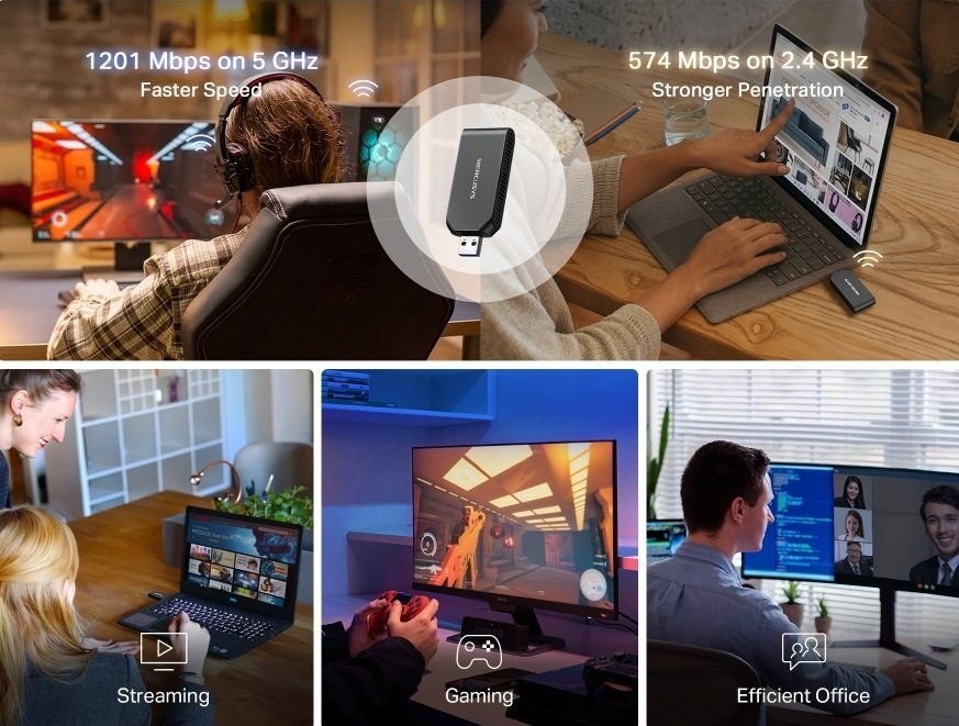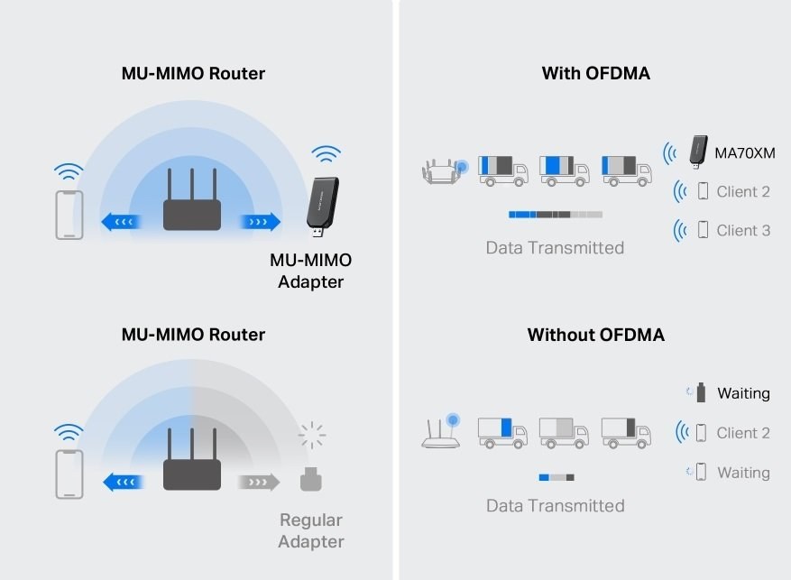MA70XM ťaží z technológií MU-MIMO a OFDMA, ktoré zvyšujú efektivitu siete pri pripojení viacerých zariadení naraz. Tieto technológie minimalizujú oneskorenie a zaisťujú plynulý prenos dát aj v zaťažených domácich sieťach, čo oceníte pri práci z domu, online výučbe alebo hraní hier. Adaptér sa výborne hodí do smart domácností či kancelárií, kde býva na Wi-Fi vysoký nápor.