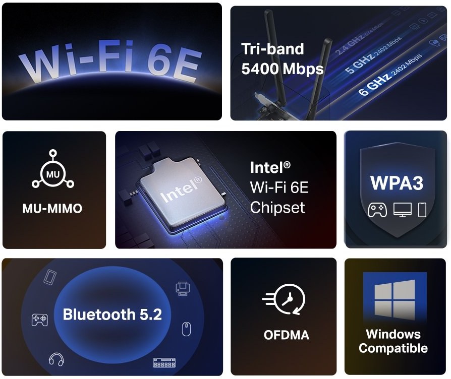 MA86XE vybaví váš počítač technológiou Wi-Fi 6E a úplne novým pásmom 6 GHz, čím odomkne plný potenciál vášho smerovača Wi-Fi 6E. Zažite neblokovanú sieť v exkluzívnom pásme pre zariadenia Wi-Fi 6E, ktorá zabraňuje poklesu rýchlosti a rušeniu zo starších zariadení.