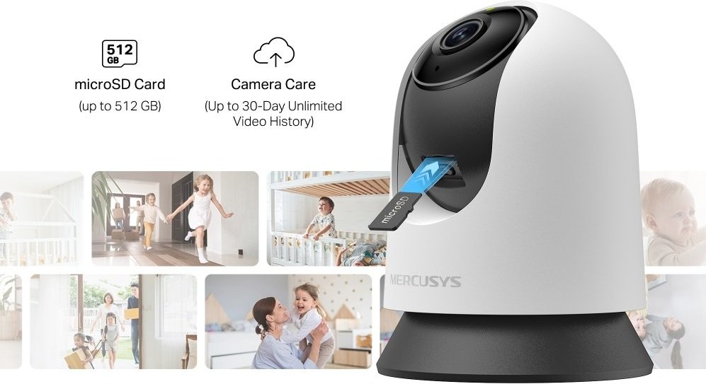 Pre ukladanie záznamov ponúka MC210 lokálne úložisko na microSD kartu až do 512 GB, ako aj cloudové úložisko prostredníctvom služby MERCUSYS Camera Care. Kamera podporuje nastavenie blokovaných zón, čím si môžete zachovať súkromie v určitých častiach miestnosti. Ovládanie je možné cez mobilnú aplikáciu, ako aj hlasovo pomocou Google Assistant a Amazon Alexa, čo zvyšuje komfort používania.