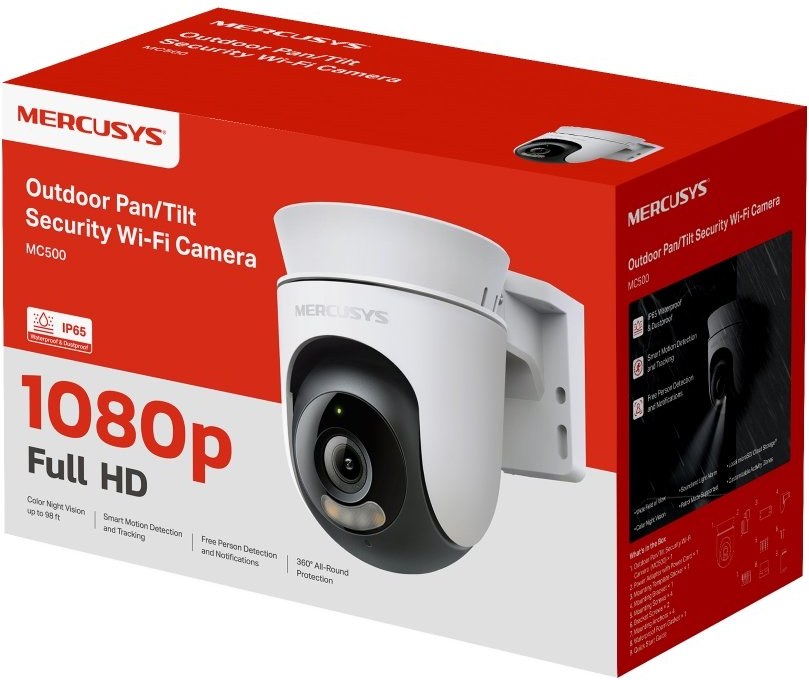 Mercusys MC500 je moderná vonkajšia otočná bezpečnostná Wi-Fi kamera, ktorá prináša 360° horizontálne pokrytie a ostrý obraz v rozlíšení 1080p Full HD. Vďaka tejto kombinácii získate kompletný prehľad o dianí okolo vášho domu či firmy bez slepých miest. Kamera je navrhnutá tak, aby poskytovala nepretržitú ochranu a jednoduchú inštaláciu na stenu, strop alebo stožiar, pričom jej odolnosť voči poveternostným podmienkam zaručuje certifikácia IP65.