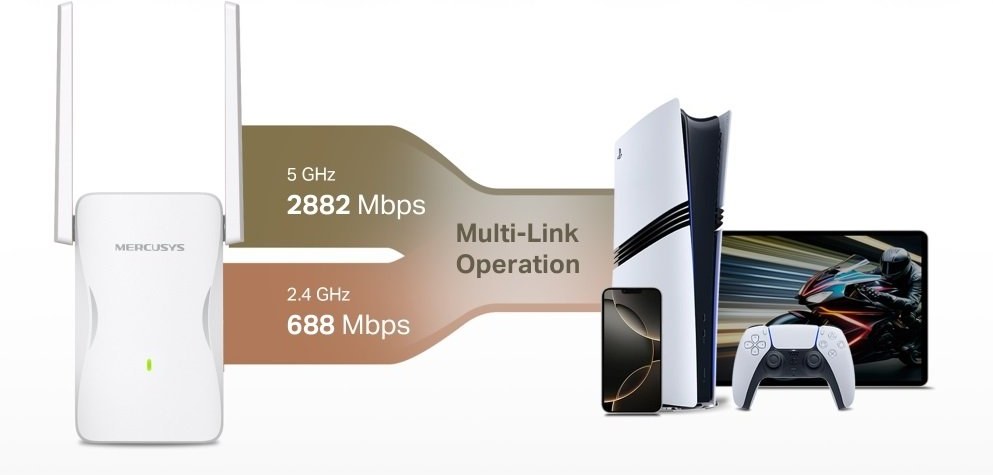 Mercusys ME25BE je výkonný Wi-Fi 7 extender, ktorý prináša najnovší štandard bezdrôtového pripojenia do vašej domácnosti. Vďaka technológiám ako Multi-Link Operation (MLO), 4K-QAM modulácia a 160 MHz kanály, dosahuje kombinovanú rýchlosť až 3,6 Gb/s – konkrétne 2882 Mb/s v pásme 5 GHz a 688 Mb/s v pásme 2,4 GHz. Tieto parametre zabezpečujú plynulé streamovanie videí vo vysokom rozlíšení, hranie online hier bez výpadkov a rýchle sťahovanie veľkých súborov.