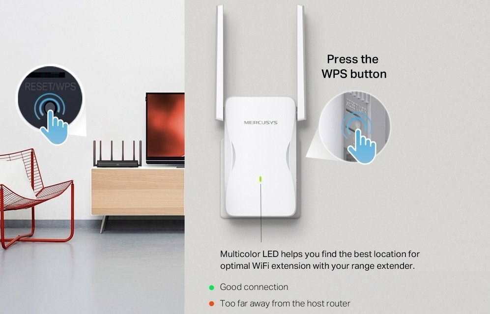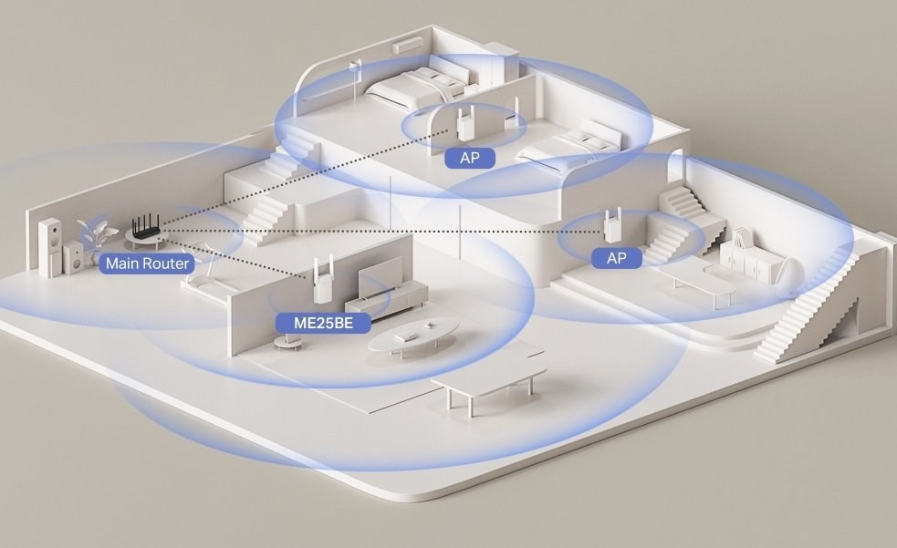 Inštalácia ME25BE je mimoriadne jednoduchá – stačí stlačiť tlačidlo WPS na extenderi, a zariadenie je pripravené na použitie v priebehu niekoľkých sekúnd. Pomocou multifarebného LED indikátora ľahko nájdete optimálne miesto pre umiestnenie extendera. Okrem režimu rozšírenia signálu je možné ME25BE použiť aj ako prístupový bod, ak ho pripojíte k internetu cez Ethernet – ideálne pre priestory, kde je dostupné káblové pripojenie.