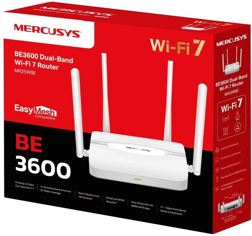 Mercusys MR25WBE je moderný dvojpásmový Wi-Fi 7 router, ktorý prináša rýchlosť až 3,6 Gbps (2880 Mbps v pásme 5 GHz a 688 Mbps v pásme 2,4 GHz). Vďaka technológiám ako 160 MHz kanály, 4K-QAM a Multi-Link Operation (MLO) poskytuje vyššiu priepustnosť, nižšiu latenciu a stabilnejšie pripojenie. Tento router je ideálny pre náročné aplikácie, ako je 8K streamovanie, AR/VR hranie, videokonferencie či rýchle sťahovanie veľkých súborov.