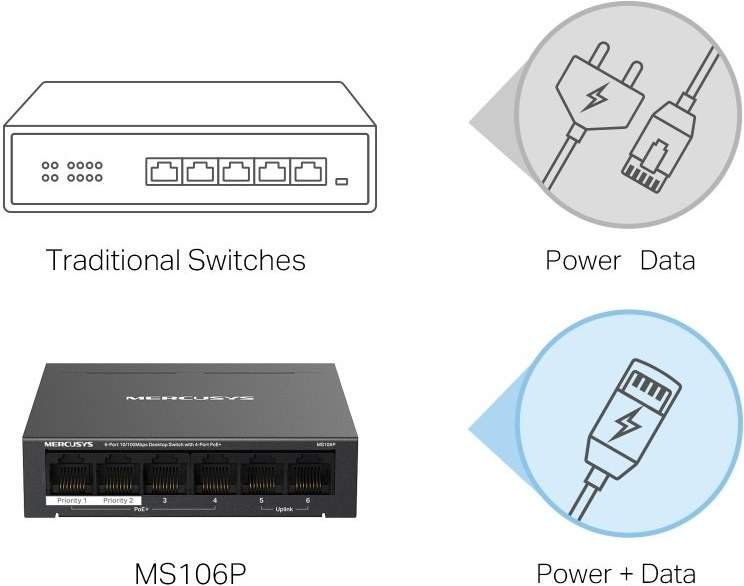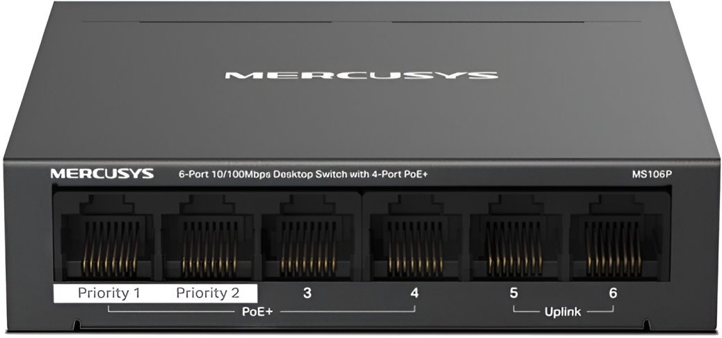 Mercusys MS106P je navrhnutý ako unmanaged switch, čo znamená, že nevyžaduje žiadnu konfiguráciu – stačí ho zapojiť a funguje okamžite. Vďaka funkcii Plug and Play je jeho nasadenie rýchle a bezproblémové. Prepínač má odolný kovový kryt, ktorý zabezpečuje efektívne chladenie a dlhú životnosť aj pri nepretržitej prevádzke. Je vhodný na stolnú aj nástennú montáž, čo poskytuje flexibilitu pri umiestnení.
