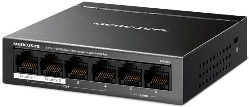 Mercusys MS106P je kompaktný stolný sieťový prepínač, ktorý ponúka 6 portov RJ45 s rýchlosťou 10/100 Mbps, z toho 4 porty podporujú technológiu PoE+. Táto funkcia umožňuje prenášať dáta aj elektrickú energiu cez jeden ethernetový kábel, čo výrazne zjednodušuje inštaláciu zariadení ako IP kamery, bezdrôtové prístupové body či VoIP telefóny. Každý PoE+ port dokáže poskytnúť až 30 W výkonu, pričom celkový rozpočet pre všetky PoE porty je 67 W.